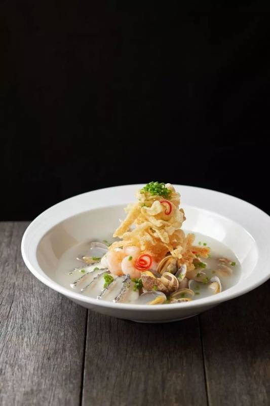 亮点是用炒河粉+炸河粉呈现双重口感,配料有啦啦、虾和鱼片,视觉上非常丰盛。