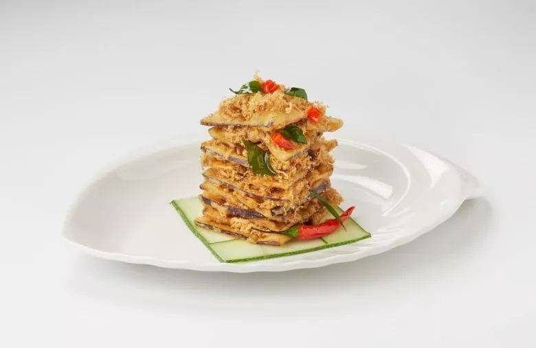 茄子切片后油炸,再洒上咸咸香香的猪肉松,香脆美味,可作为小菜或主菜。