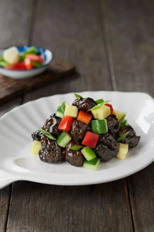 把切丁的猪肉裹上竹炭粉和黑醋,有别于一般传统的“橙色”咕老肉。猪肉外脆里嫩,再加上浓郁的酱汁,特别下饭。