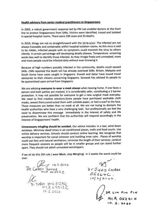 声明中认为,有别于2003年的SARS病毒,2019新冠病毒较难追踪且病症轻微,一些感染者甚至不会出现任何症状,这使得病毒在神不知鬼不觉之间传染给他人。但如果双方(健康者和感染者)都戴上口罩,至少形成双重保障。 声明最后表示,如果大家都做到2M原则(戴口罩和停止聚集),相信新加坡能在两周内度过最难的一关。