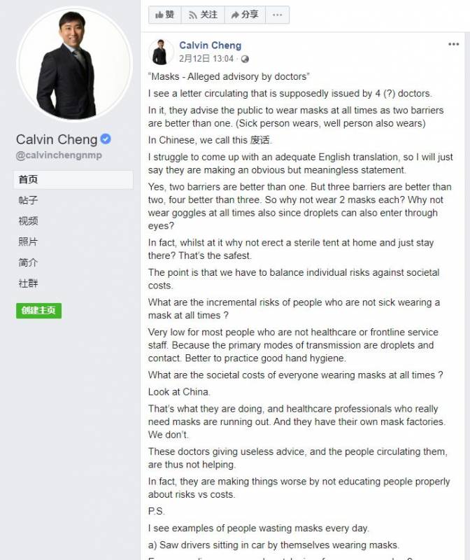 另一方面,有网友注意到,前官委议员郑恩里Calvin Cheng在2月12日下午1点左右,同样就四名医生的联署声明,在面书上发表了自己的观点,并说: “用中文来说,我们把这称为‘废话’。” 一起来看看他的原文吧: