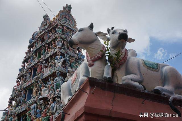 牛头建筑&小印度新加坡是华人的聚集地,路人也皆是说中文或者英文,也有不少日本人在此中国;作为旅行地来说,多了几分熟悉感,却少了几分异域风情。如果你像我一样喜欢异域感,牛车水是不得不去的地方。牛车水最古老的寺庙建筑门顶很有创意,两只牛蹲在那里超威武,最身穿各种服饰的人,堆成塔字形状。最早这个寺庙是供奉驱逐瘟疫的神明的,据说这些都是印度教的神明,后来还成为可以主持婚礼的地方。