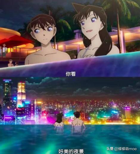 无边泳池是这边的一个超大的噱头:小兰和新一再次牵手撒糖,还感叹,这城市风光真是无敌美。可惜这这是电影吊大家胃口的方式,看过剧场版后大家才发现,这个难得的新兰同框却是假的——新一是基德假扮的,柯南在旁边气到冒烟。