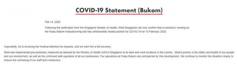 (新加坡15日讯)一名在毛广岛(Pulau Bukom)工作的石油公司蚬壳(Shell)承包商,日前被确诊患上武汉肺炎(2019冠状病毒疾病)。