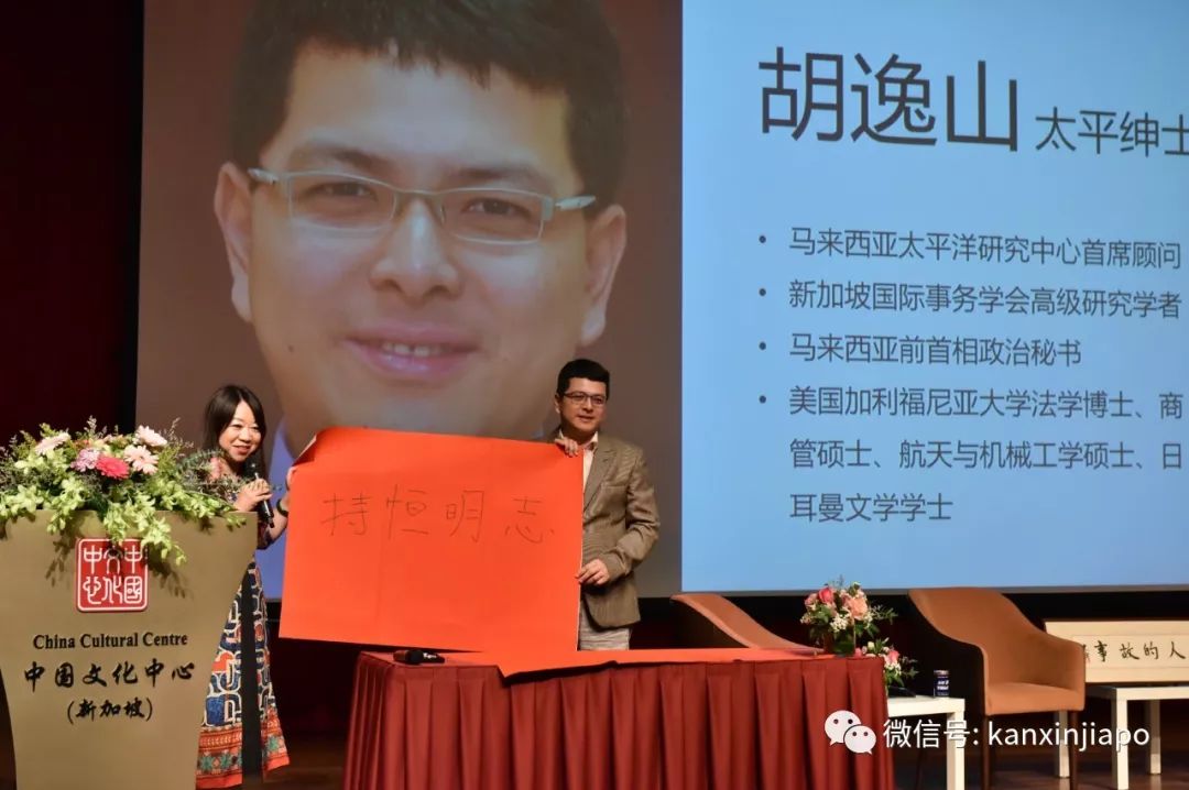 “他从16岁开始进入美国加利福尼亚大学,在8年内获得1个博士、2个硕士、3个学士学位,横跨4个专业领域:法律、商管、工程、日耳曼文学,精通5种语言:马来文、英文、华文、法文、德文……”主持人的介绍,让全场来宾惊叹。在期待的掌声中,著名国际关系学者、马来西亚前首相政治秘书胡逸山太平绅士来到舞台,在签名台上从容地写下“持恒明志”的人生格言。他用生动的语言,深入浅出地剖析了与时俱进的新中关系、东南亚视角中的一带一路,并展望了世界格局。