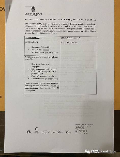隔离居家的日子我变得敏感起来,体温如果36度9,我就担心下一次的体温会不会超过37度,喉咙有时候发痒,偶尔咳嗽两声时,我就想不会是真的中招了吧?14日下午,除了视频,卫生部还另外打电话给我,说就站在我家门口,我一听竟然心里有点紧张,没想到他们真的上门来查岗了。打开门,原来他们是来宣布我的隔离期已到,可以自由活动了,并递给我一份文件要我签字,同时还有几份文件让我带回公司,这是政府补偿给雇主每天100块钱补贴的填写表格。
