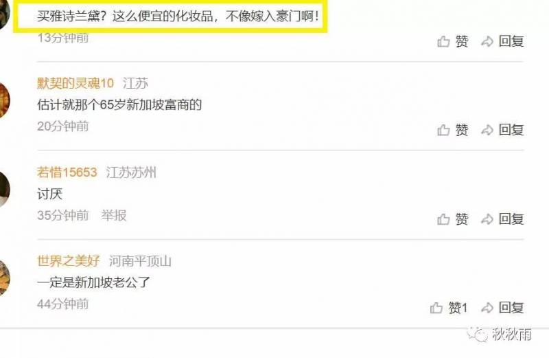 有的网友说到:“买雅诗兰黛?这么便宜的化妆品,不像嫁入豪门啊!” 只想说,这位网友太有钱了!也有的网友说:“肯定嫁入豪门了!买这么贵的化妆品?”