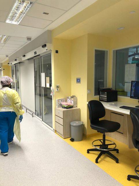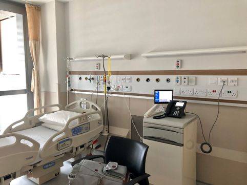 我的病房在八楼,病房外面有一台电脑,负责左右两间病房的资料。隔离病房有两层玻璃门,它们不能同时打开。房间是双床,疑似病人只能单独隔离,而确诊病人是可以双人同住的。