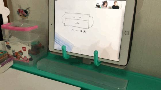 老师在屏幕那头画好之后,小彩虹迅速跟上。还给小口罩画上了表情,加入了自己的想法。