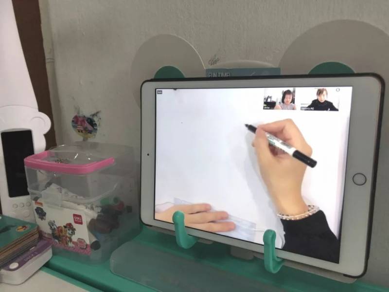 通过APP,小彩虹见到了可欣老师,老师说话的声音很清楚,就跟面对面一样!老师的画纸出现在大屏幕上,清晰明了。