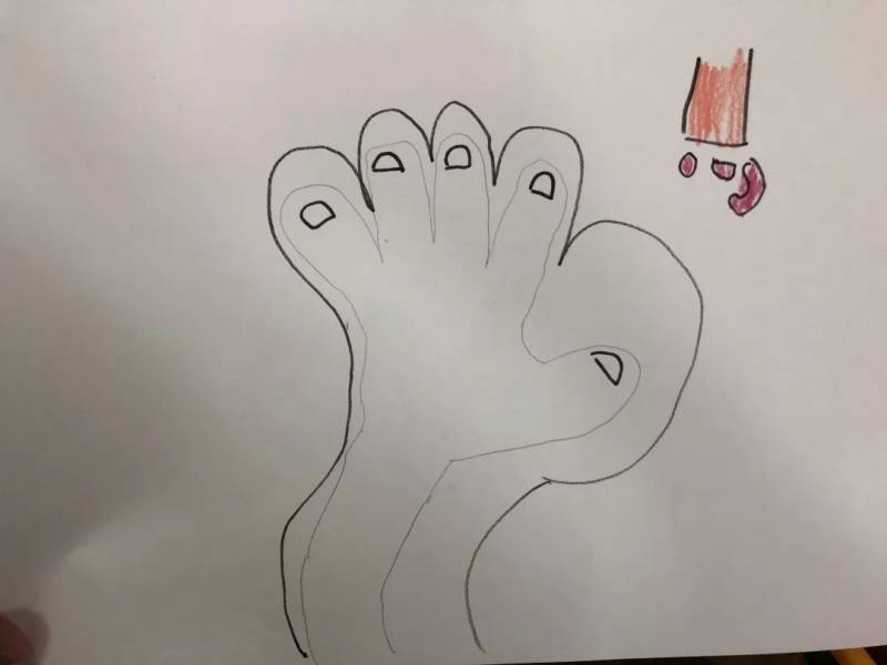 对抗病毒,最重要的一个防范措施就是洗手,可欣老师让小彩虹在白纸上画上自己的小手,还有水龙头和肥皂。