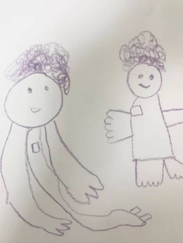 最后,可欣老师告诉小彩虹,现在在一线与病毒做斗争的是我们的医生和护士,我们一定要感谢他们,为他们加油打气。小彩虹画了一个护士阿姨,病毒被消灭了之后站在彩虹下面。