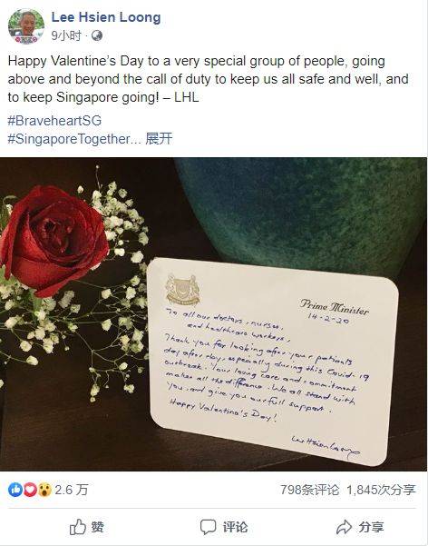 新加坡总理李显龙2月14日情人节时,在社交媒体发文祝福新加坡的医护人员,并感谢他们在新冠肺炎暴发期间的付出。