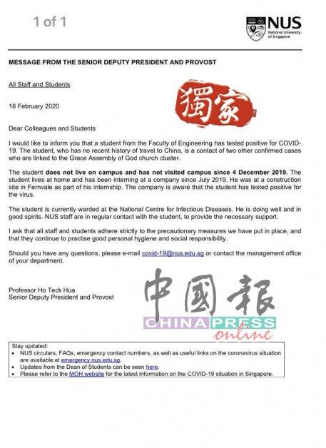 (吉隆坡16日讯)新加坡国立大学强调,日前被确诊患上武汉肺炎的该校工程系学生,并不是住在学生宿舍,自去年7月开始已经到一家公司实习上班,因此呼吁在校学生保持冷静。