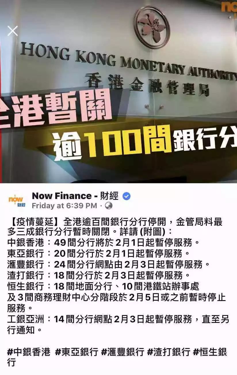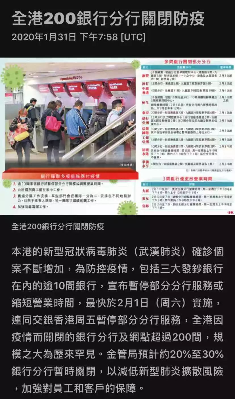 近日,鉴于香港的新型冠状病毒肺炎疫情蔓延。为了防控疫情,香港暂停部分银行分行服务或缩短营业时间。