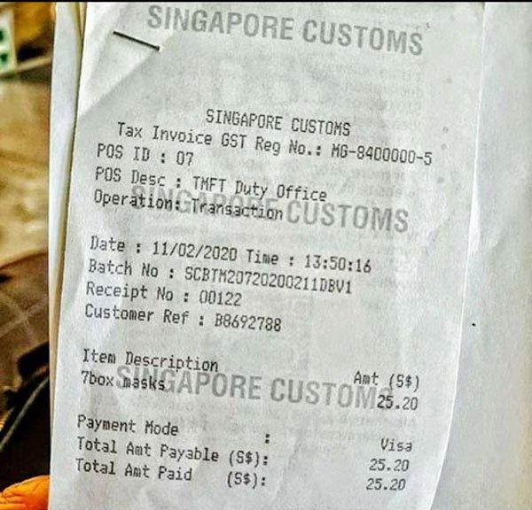 有网友因携带7盒口罩入境,需缴付25.20新元(约76令吉)税务。