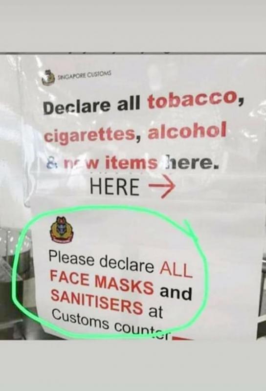 新加坡关税局回应CNA询问时,这样指出。较早前,社交媒体流传一个相信是在入境关卡的通告,可见除了贴有“烟酒需申报”的通告,下方还贴有新通告写着“所有口罩及搓手液需在海关柜台申报”。