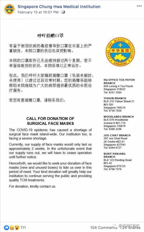 中华医院13日通过面簿专页及IG等管道,发布筹募口罩的信息。 帖文中透露,冠病疫情造成市面上口罩严重缺货,院方库存无法维持超过两周,若不幸断货,医院将难以正常运作,希望公众能捐赠包装未解封或未使用的口罩。所幸的是,大部分国人都是爱心满满的,光是位于义顺的中华医院分院,一天内就收到约500片口罩。