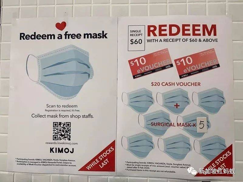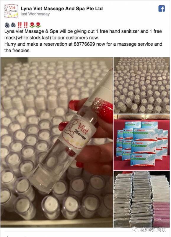 按摩水疗店从2月5日至12日,也三次发帖文说,凡是到店里光顾的顾客,都能免费获得一支消毒洗手液以及一片口罩,先到先得。 另一家首饰店Kimoj也推出促销,凡是在店里消费满60新元或以上,就能获得礼券以及五片口罩。