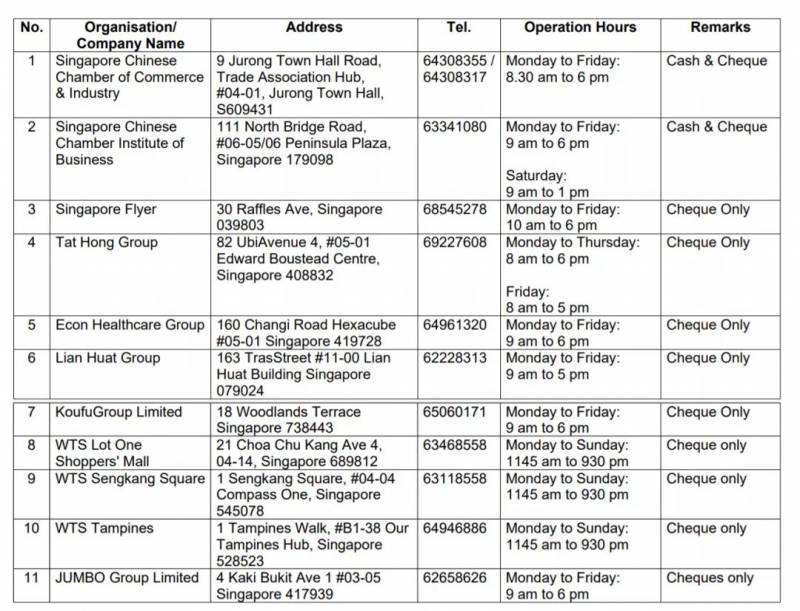 欲捐款者可亲临总商会办公室或总商会在全岛设立的11个地点递交捐款支票,总商会将把捐款支票交给新加坡红十字会。