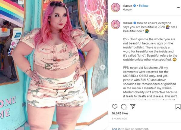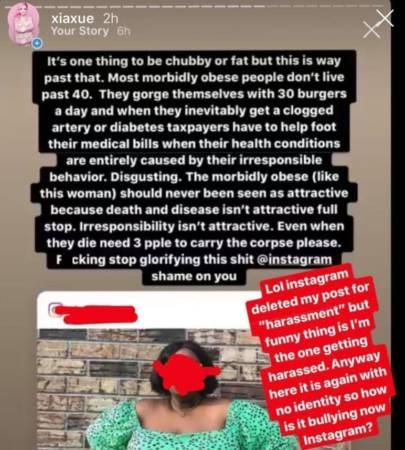 下雪本月14日在Instagram 限时动态上贴出一张大尺码模特儿的照片,并表示:“很多病态肥胖的人士都活不过40岁。他们一天吞下30个汉堡,然后动脉阻塞或是患上糖尿病后,纳税人还要为他们支付医药费,但其实这一切都是因他们不负责任的行为所引起的。”