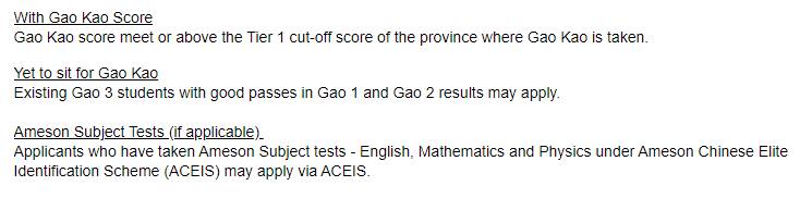 所有国际学生在注册成为南洋理工大学学生前须满足12年基础教育,中国学生必须在注册前完成三年高中学习并取得高中毕业证书。