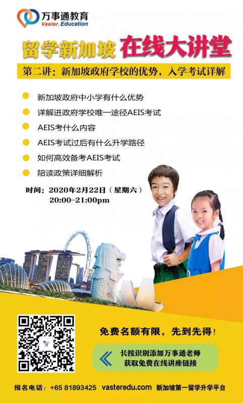 话不多说,关于入读新加坡政府中小学的最强讲座已经蓄势待发啦~锁定2月22日晚上8:00-9:00,我们不见不散~