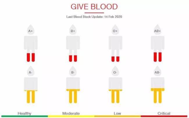 新加坡红十字分享了目前血库中,A-、B+、AB-和O+血性的库存图表。