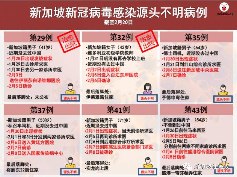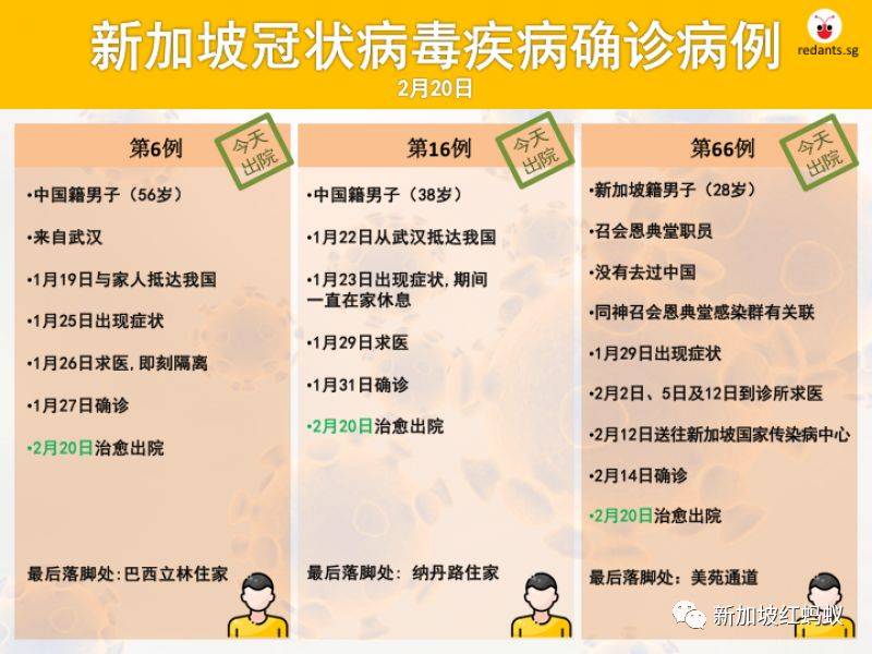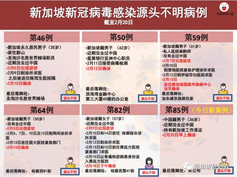 新增病例:中国籍客工 今天新增的第85名患者,是36岁的中国籍男子,持有工作准证在新加坡工作,近期没去过中国。他是在20日上午确诊,目前在国家传染病中心接受隔离治疗,感染病毒的途径目前仍不清楚。 今日治愈出院的三人