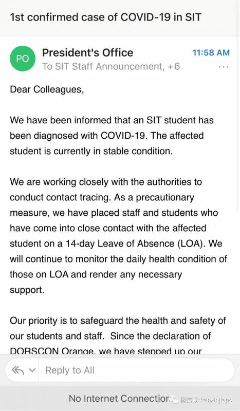 在入院前,他大部分时间留在武吉巴督东5道的家里,出现症状后就没有到大学上课。新加坡理工大学在今天稍早的时候,向师生发布了邮件: