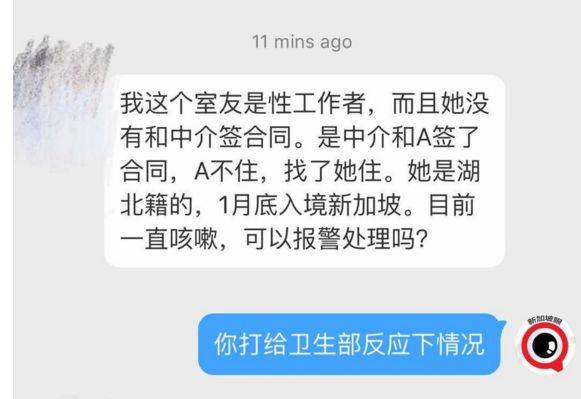 网友随后还爆料,这位湖北籍的室友是性工作者,入住的房屋合同也并非本人所签,她在1月底入境新加坡。