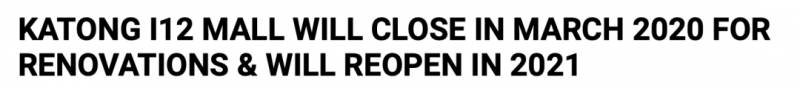 而在加东地区的商场I12 Katong也宣布将在本月月底结束营业,3月开始进行翻新工程,预计2021年重开。