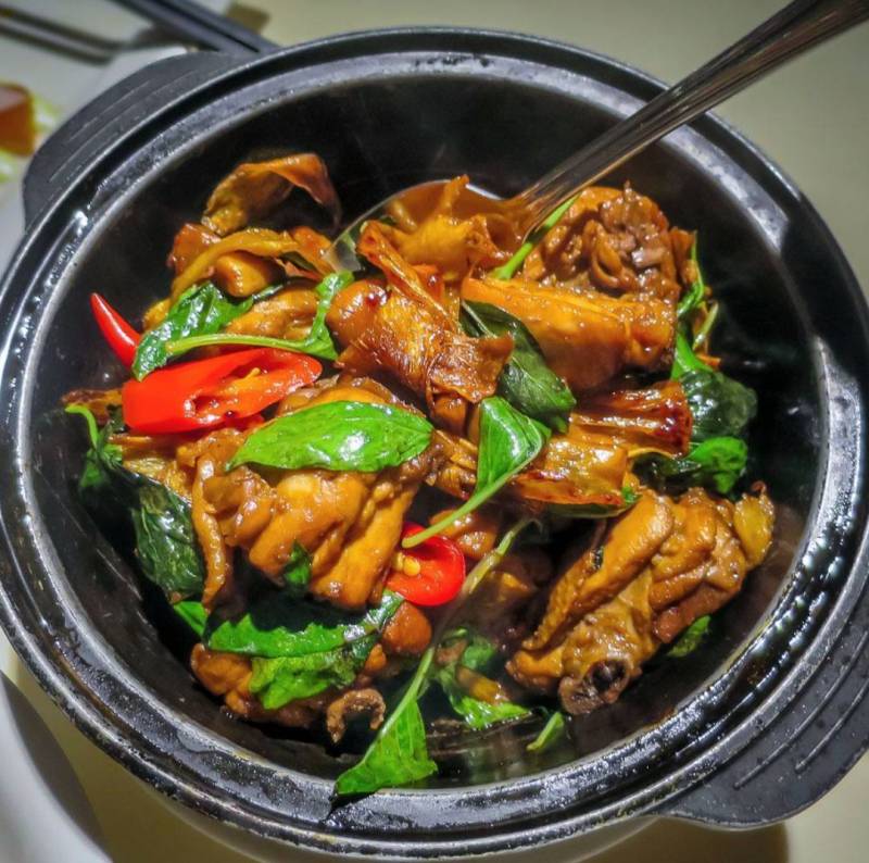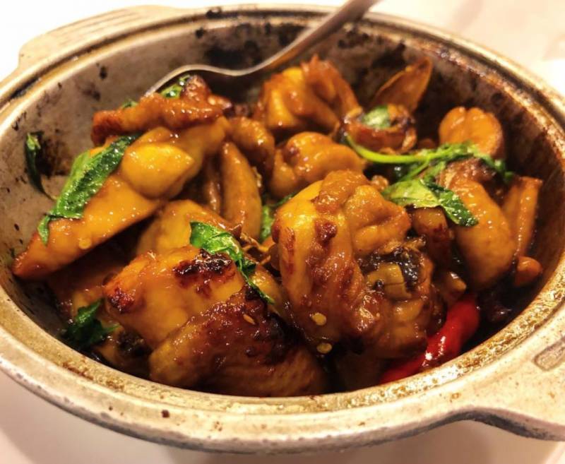 鸡肉松软细腻,肉块的边缘略微酥脆,硬币大小的姜片和蒜瓣环绕在锅周围。而三杯鸡的酱汁深色,香气扑鼻,酱油和陈年米酒贯穿其中。而大厨出锅前撒的罗勒叶则让整体口感带有植物的清香。