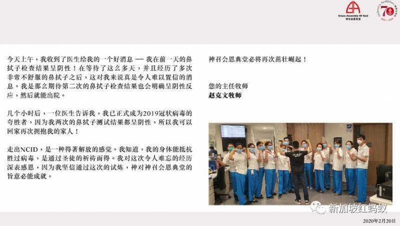 本地最大感染群神召会恩典堂的主牧师赵克文昨日也出院了。红蚂蚁猜测他应该就是今日卫生部宣布出院的10名患者中的一人,因为当中有一人是神召会恩典堂的职员。 (啊?在哪里?提示:在上面的图表里) 赵克文牧师在神召会恩典堂的网站上也给信徒写了封信,转述自己在隔离治疗期间的经历。