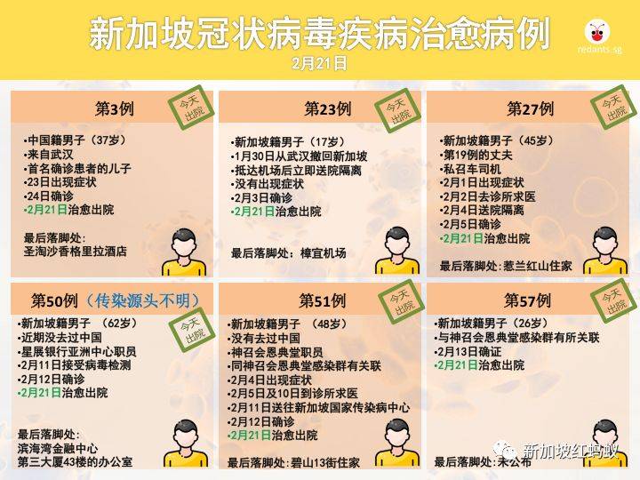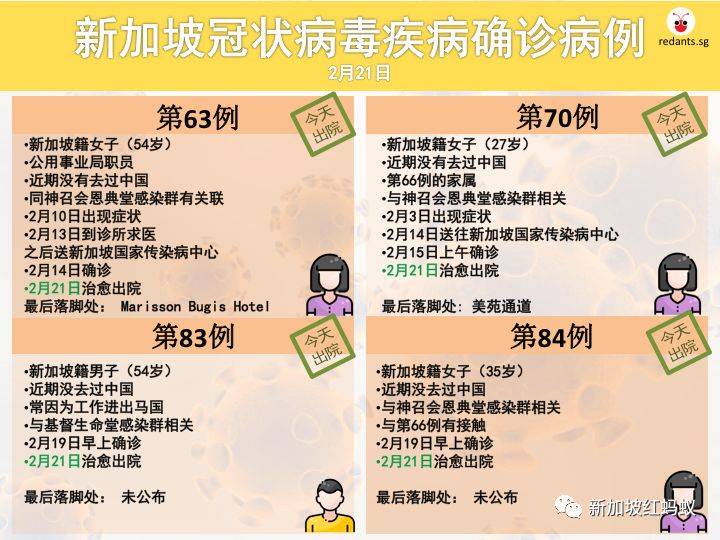 【好消息】:新加坡累计86起2019冠状病毒疾病确诊病例当中,超过半数已治愈出院! 今天(21日)康复出院的人数多达10人,创下2月4日首名患者出院至今18天以来的单日新高。累计治愈出院人数为47人(54%)。 新加坡今天只新增一例冠病确诊。患者是一名新加坡理工大学学生(24岁新加坡籍男子),近期没去过中国,但与第82例病患有过密切接触。第82例病患就是那位患上骨痛热症被送入黄廷方医院的57岁新加坡籍女子。她是目前本地唯一一名同时感染骨痛热症和冠状病毒疾病的患者。 这名理大男生在2月14日出现症状后,先后在16日和18日去了两家家庭诊所看病。2月19日去了黄廷方医院的紧急部门求医,立即被留下隔离治疗。隔天(20日)检测结果显示。确诊感染了冠病病毒。入院前一直住在武吉巴督东5道的住家,出现症状后就没再去理大上课。 越来越多患者在确诊后两三天就康复 另一个值得注意的好现象就是,最近有越来越多患者在确诊后的两三天内就康复出院。 例如,在今天治愈出院的10人当中,就包括了前天早上刚刚被确诊的第83例(与基督生命堂感染群相关)和84例(与神召会恩典堂相关)患者。他们在两天内连续两次检测都呈阴性反应。这是目前国家传染病中心用于测试患者是否能获准出院的硬指标。 18日出院的那名1岁男童(第76例)也是在16日确诊,两天内就出院。 2月21日出院的10名患者详情如下