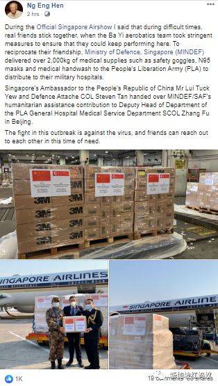 在新加坡航空展上我曾说过,患难见真情,真正的朋友在最困难的时期是不会抛下对方的,就像中国人民解放军空军八一飞行表演队做足了万全防疫准备,为的就是不要在航空展上失约。为了回馈这份友谊,新加坡国防部运送了超过2000公斤的医疗装备,例如护目镜、N95口罩、医疗洗手液等给中国人民解放军分派给属下的军医院。“在这场疫情里,我们对抗的是病毒,在这种最需要的时刻,朋友们可以伸出援手相互关照。”