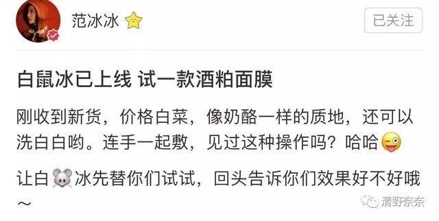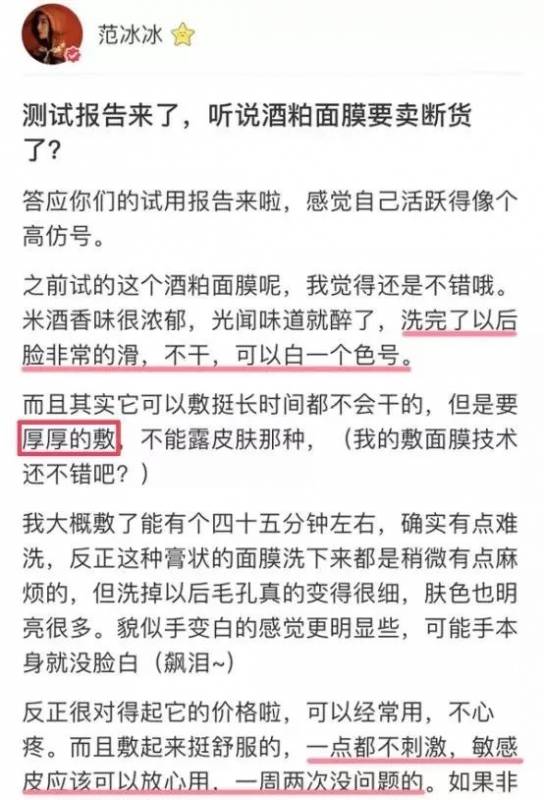 范冰冰发布的试用报告非常详细,就跟美妆博主一样敬业。里面说到这款面膜洗完了以后脸非常滑,不干,可以白一个色号。