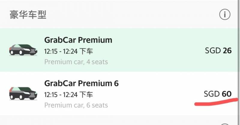 用车软件Grab从樟宜机场前往该地点6座豪华车的非忙时报价,最高为60新币。
