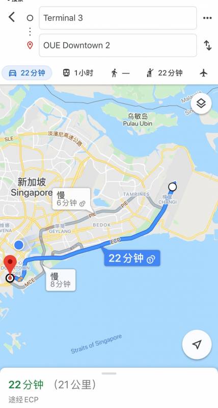 谷歌地图显示樟宜机场3号航站楼与目的地之间的距离是21公里,开车仅需22分钟。