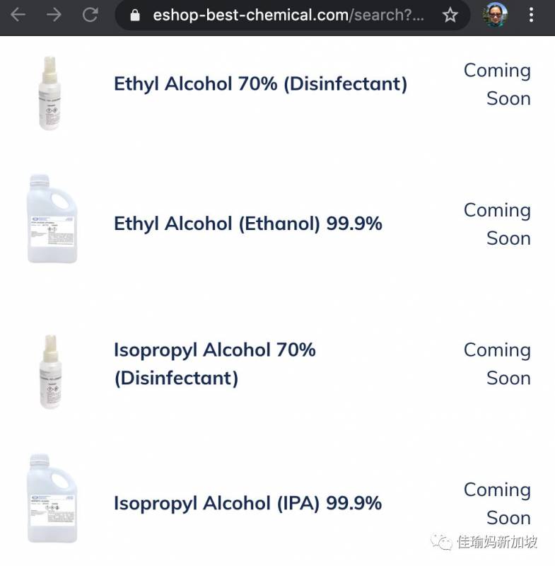 在线零售商Redmart断货几周了妈妈们如果还想试试运气,可以尝试联系一下本地的化学原料供货商。佳瑜妈当时考虑是否要买医用酒精的时候,零售商都没货了,化学原料供货商还有货。例如下面这家。现在也是没货了,感兴趣可以咨询一下。
