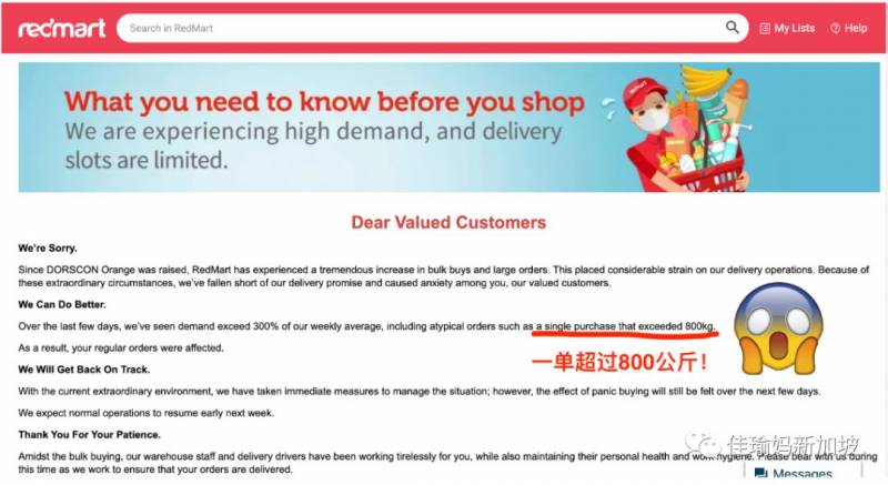 图片来源:联合早报网站目前新加坡的生鲜电商Redmart配送还比较缓慢。从次日配送延迟到了下周配送,原因是有很多激增的大额订单。其中出现了一单800公斤的巨型订单。新加坡人囤货也是很拼的。