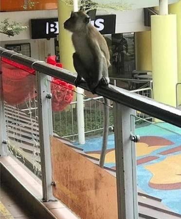 一只猴子闯入武吉班让翠绿岗购物中心内。(曾宪隆摄)