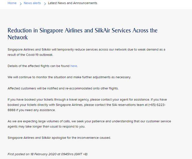 新加坡航空表示将继续观察当前局势,如果新冠病毒引起的客运需求持续下降,那么将会进行下一步的调整。