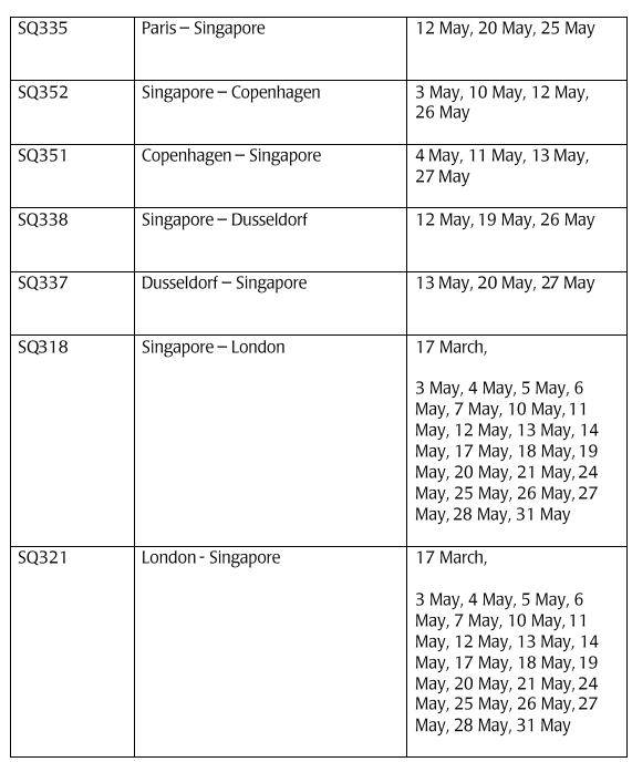 此外,新加坡和西雅图之间的以下六班航班也被取消: