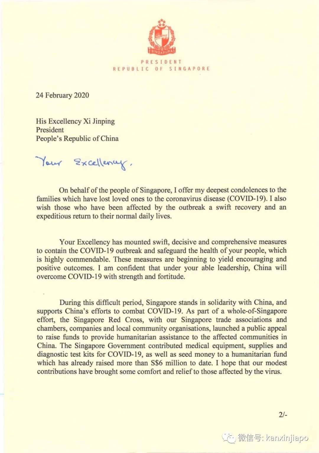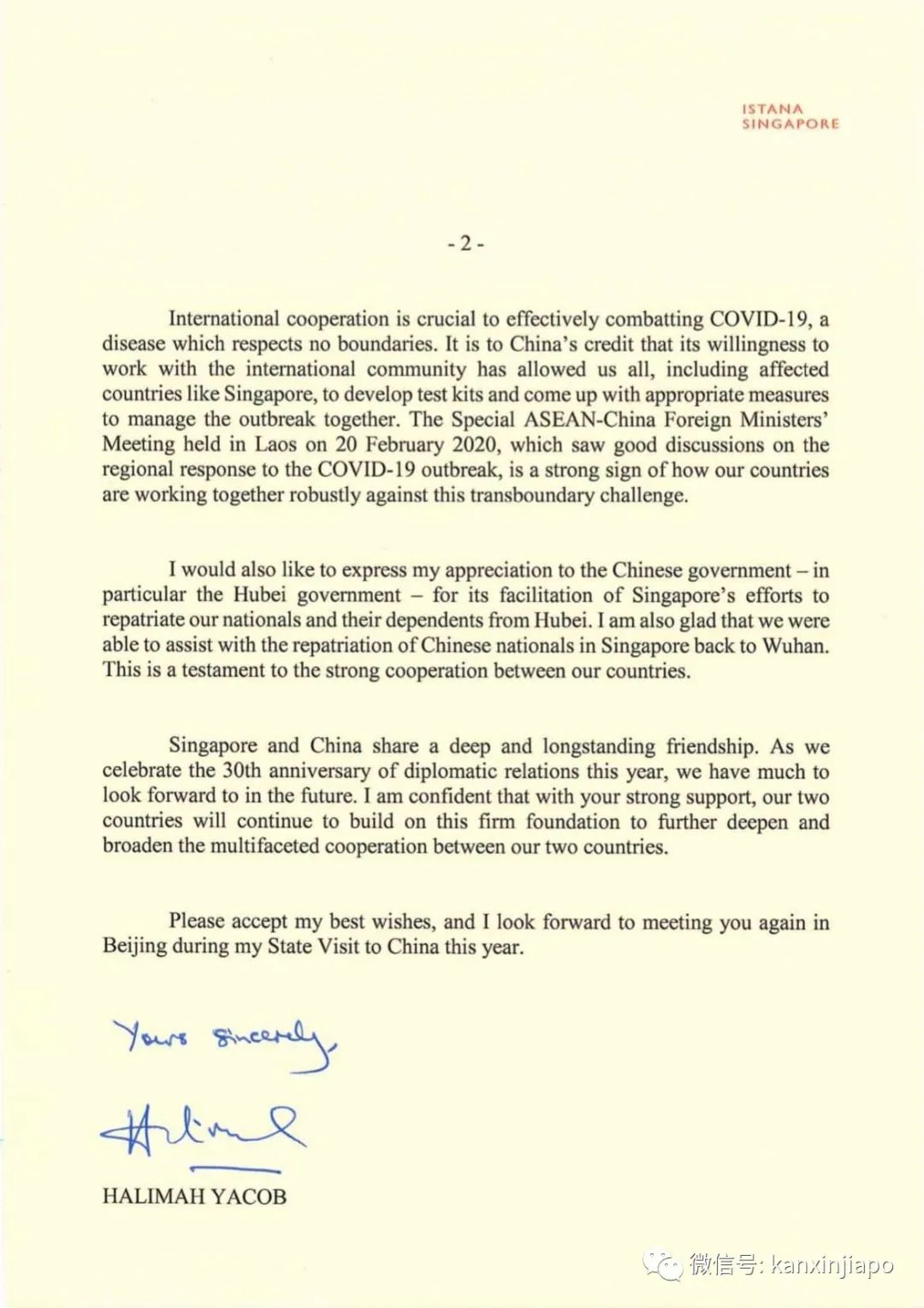新确诊的是75岁的新加坡妇女,近期并没有到过中国,她跟新加坡基督生命堂感染群有关。她在2月9日出现症状,在2月9日、17日和23日到家庭诊所看病,并在2月23日由救护车送往陈笃生医院立即被隔离,当天下午便确诊感染冠状病毒。在住院以前,患者多数时间呆在碧山12街的家里。另外,新加坡总统哈莉玛和总理李显龙,今天分别代表新加坡人民和政府,向中国领导人致函。对于在新冠肺炎疫情中失去挚爱的家庭,致以最真诚的哀悼。同时,也表达了新加坡希望在疫情应对方面,与中国展开合作。哈莉玛还特别感谢了湖北政府为新加坡撤侨包机的精心安排,和对于在武汉的新加坡人的帮助。哈莉玛非常期待今年到北京,进行国事访问。