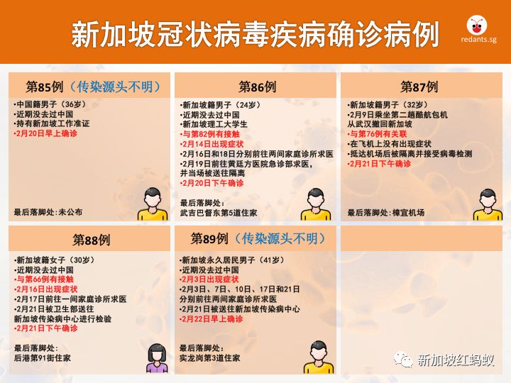 新加坡累计89起2019冠状病毒疾病确诊病例,已有51人((57.3%))治愈出院。让人大大松一口气的是,昨日(2月23日)本地并未出现新的确诊病例。这是继上周五(21日),新加坡单日出院人数多达10人后的另一大好消息。还记得红蚂蚁在确诊达50例时,给大家做了一篇参考文吗?目前确诊病例已增至89起,为方便关注本地疫情的蚁粉们收藏与参考,红蚂蚁又更新了所有的图表。很多蚁粉都感到好奇,这些冠病确诊病人的住院费到底是由谁出钱支付的?据《海峡时报》向新加坡卫生部询问,2月14日卫生部给予的答复是:新加坡政府将支付所有本地冠病确诊病人的公共医院住院费,因为这些病人必须住院留医隔离治疗。不过,政府不会支付这些病人的其他门诊费,例如去家庭诊所、综合诊疗所、或者私人医院看病的费用。确诊病例(第1~第89)