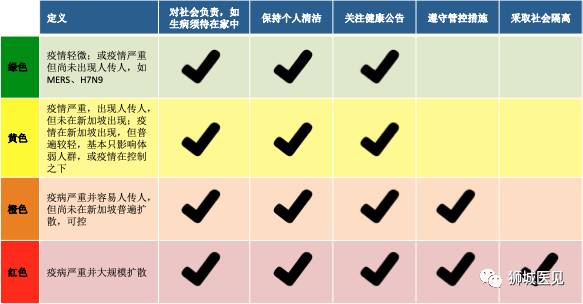 Disease Outbreak Response System Condition (DORSCON) 新加坡疫情应对系统框架。根据疫情轻重程度,通过绿、黄、橙、红四个颜色统一协调全国各界应采取的防治措施。 筛查中心的后勤工作做得很好。在休息室有很多吃的喝的,冰淇淋,烧卖,饺子等等,午餐晚餐也是定时配送。NHG的Residency专门拨款给筛查中心的工作人员买水和饮料。