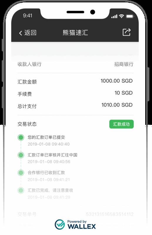 红杉资本被中国媒体描述为中国最著名的风险投资家,在国内红杉资本投资了阿里巴巴、美团、唯品会等互联网巨头。红杉资本对熊猫速汇的支持说明他们相信熊猫速汇将成长为一家伟大的公司,服务全球海外华人。 03 实时跟踪汇款进度