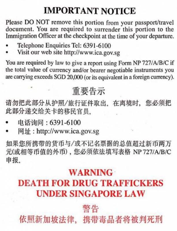 【7】携带毒品入境,死刑等着你这个可不是开玩笑的,新加坡在机场就可以看到,携带毒品入境者,死刑伺候的字样。而且听说在以前的入境登记卡上,也有写明“携带毒品入境,我们就杀了你!”,这个国家是真的很刚。