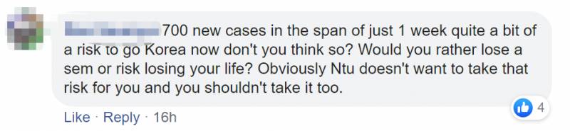 韩国已经失去了对疫情的控制,我觉得很快就会突破1000病例。NTU取消行程,做的是对的,为你的健康和安全负责。你还有很多大好时光环游世界,如果这次你不幸染病而且不能回来怎么办?学校怎么对家长解释呢?